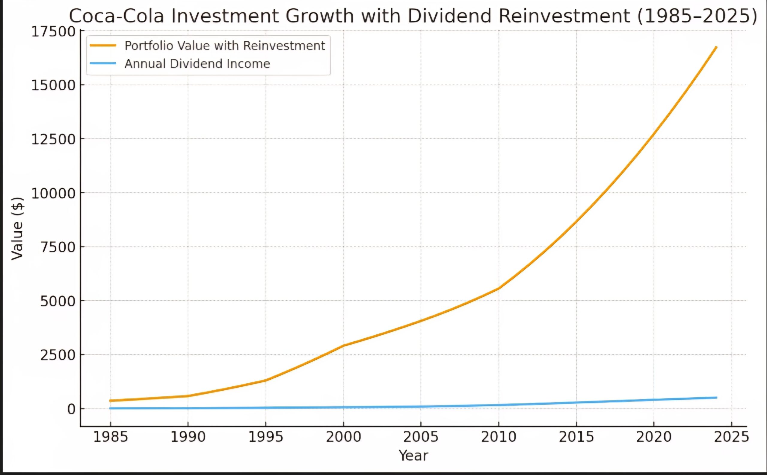 - Dividend Growth: Coca-Cola paid about $0.08 per share annually in 1985. Today, the company pays around $1.84 per share annually. That means the original $350 investment now generates over $4,400 in dividends per year.